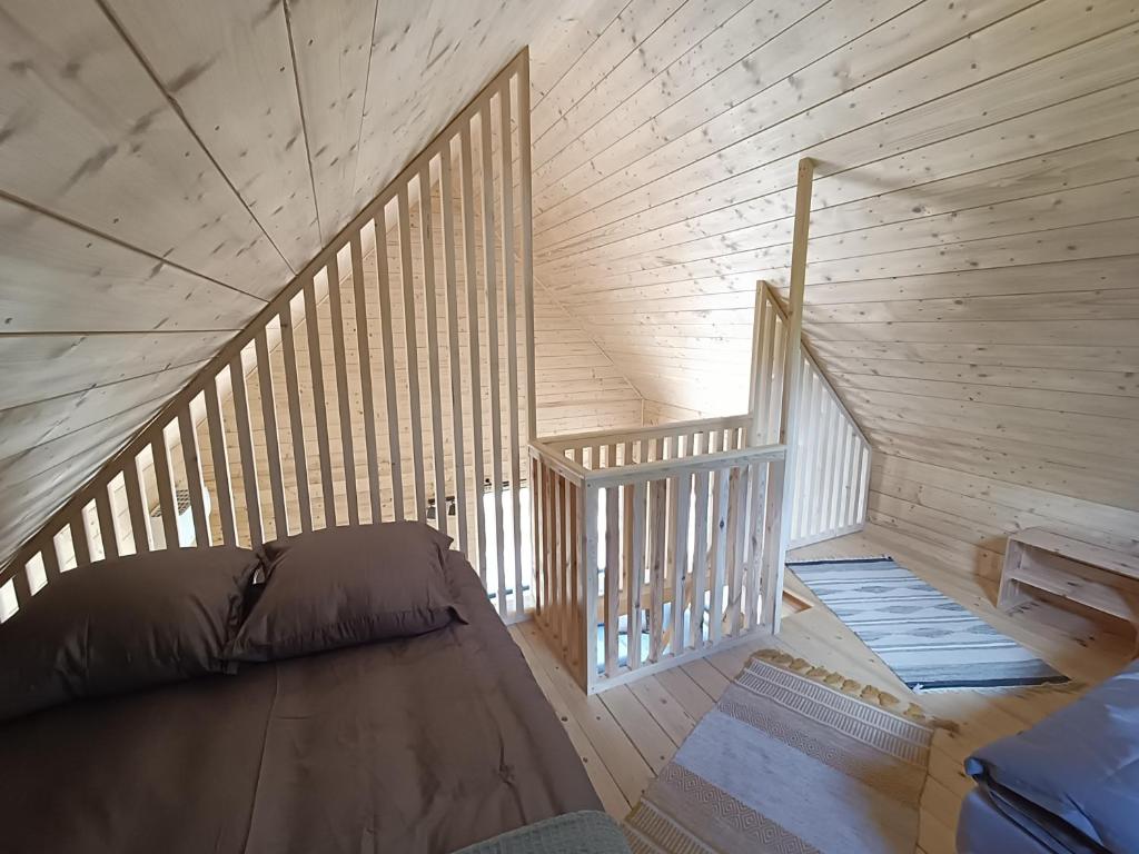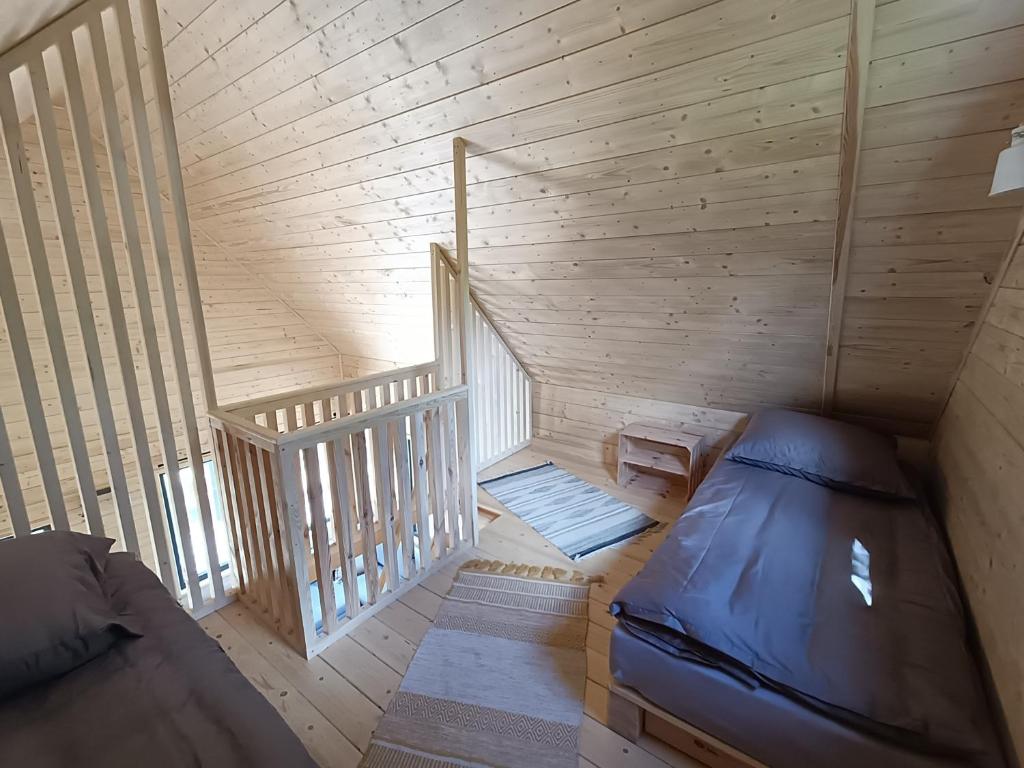 Domek został zaprojektowany tak, aby zapewnić komfort nawet czterem gościom. Posiada dwie sypialnie – pokój oraz antresolę z dużymi łóżkami – i łazienkę. Salon i kuchnia tworzą przestrzeń wspólną do odpoczynku czy wieczornego kina, gdy akurat pogoda za oknem nie sprzyja.